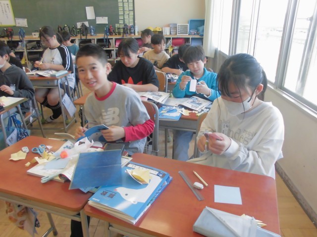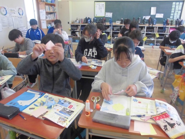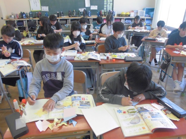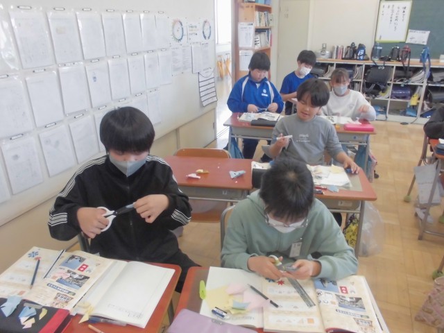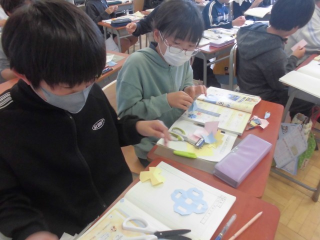 色紙を折って、切って、広げて、線対称・点対称の図形を切り出し、ノートに貼ります。