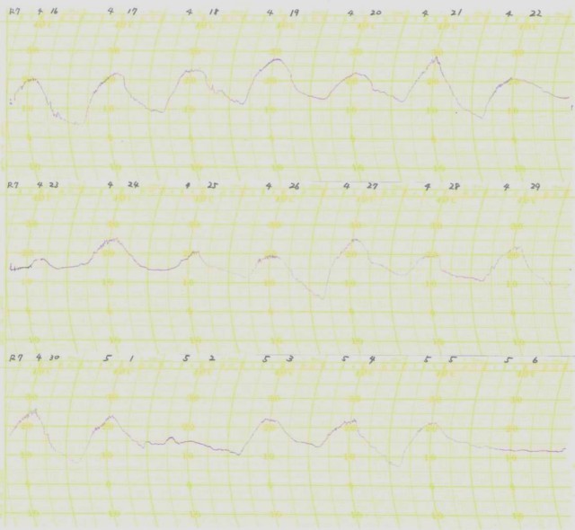 自記温度計の記録を見て、その日の天気を読み取りました。