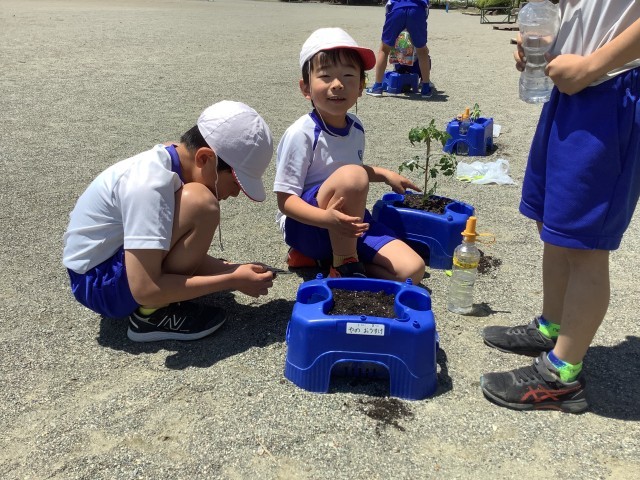 野菜の苗を植えました。子どもたちが思い思いの苗を持ってきて、目をキラキラさせながら苗を植えました。ミニトマト、ナス、トウモロコシなどなど。元気に育ちますように。