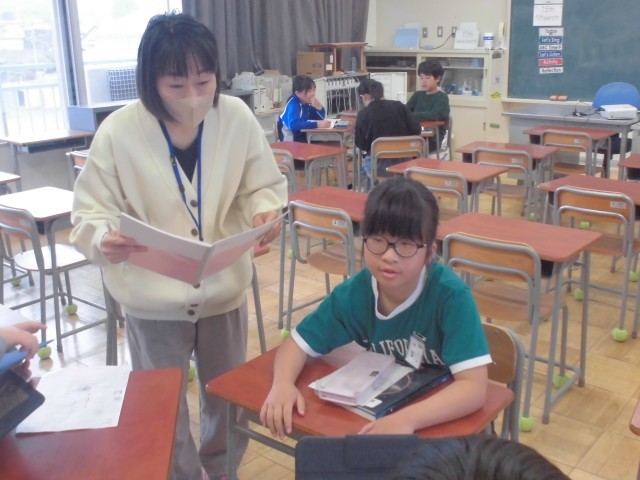 教室で漢字練習のようすと、交流学級で班ごとの話し合い活動のようすです。