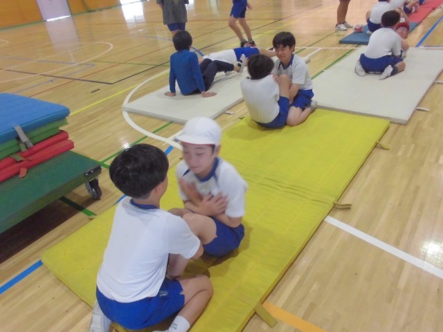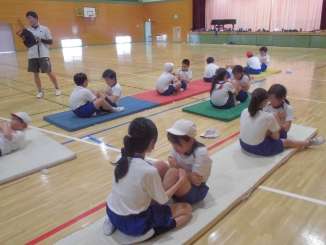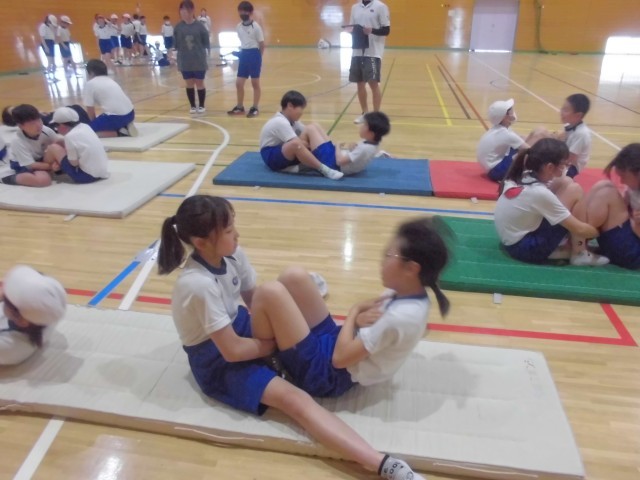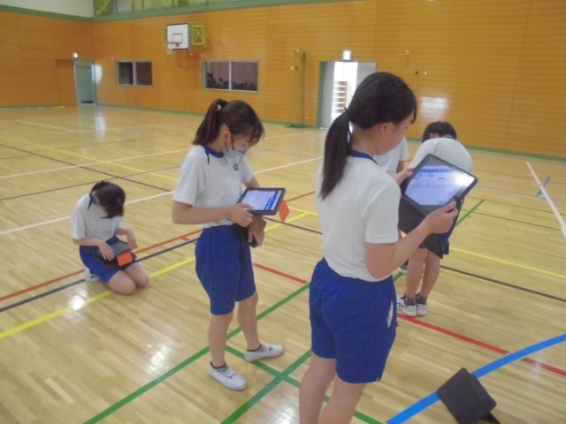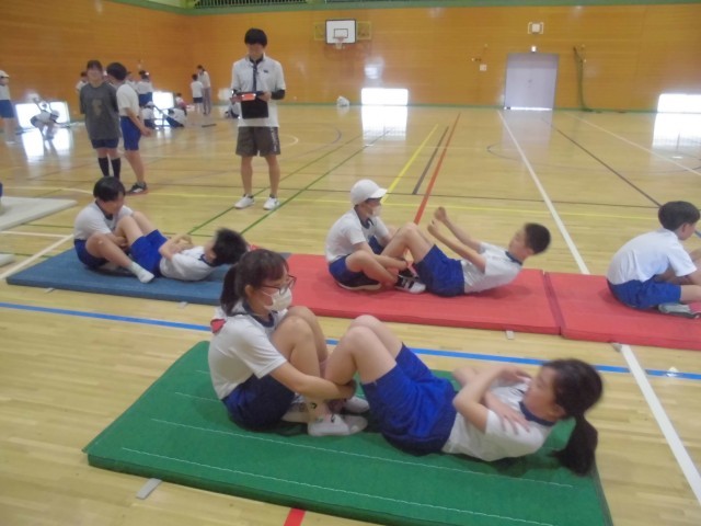体力テストの腹筋の練習場面でした。結果はタブレットに記録します。
