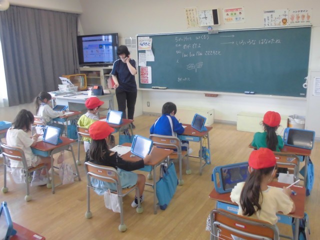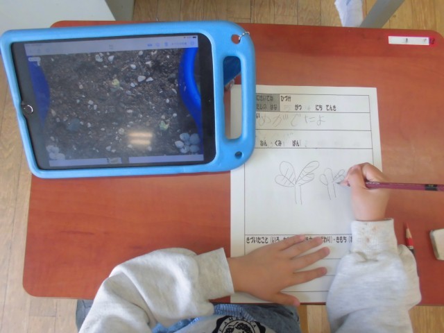 アサガオの芽が出たので、タブレットで写真に撮り、教室で画像を見ながら観察記録にまとめます。