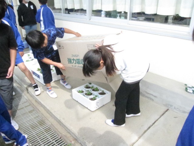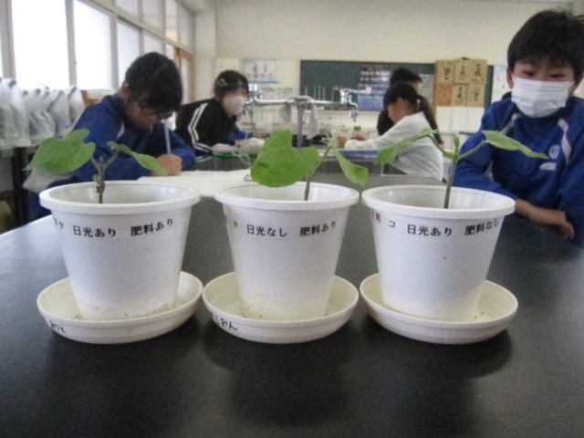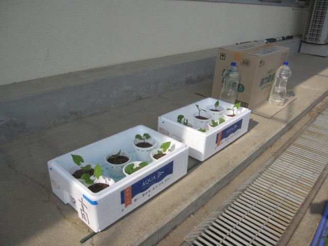 発芽した植物が成長する条件を調べる実験をセットしました。しばらくしたら、結果を確認します。