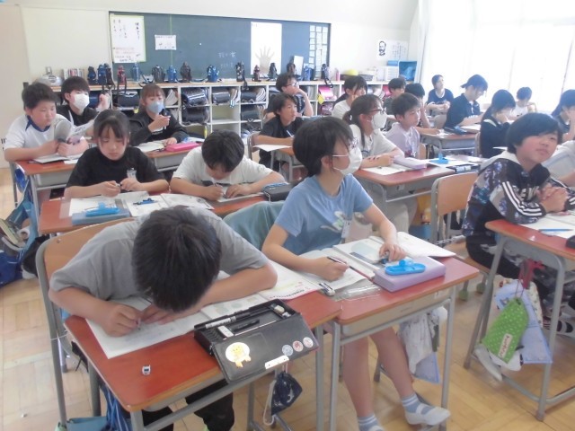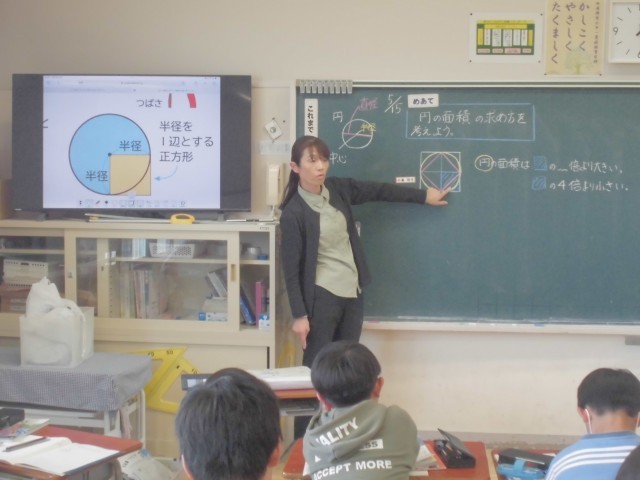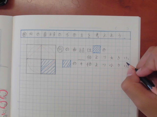 これまでの学習をフル活用して、円の面積の出し方を考えます。ノートもきれいにかけています。