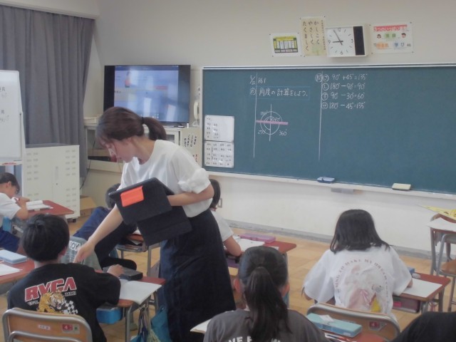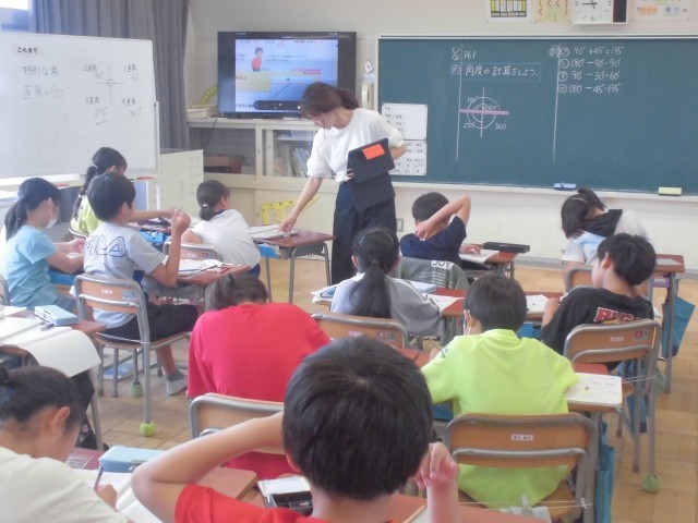 角度の計算に入りました。タブレットを効果的にテレビに投影し、分かりやすく解説しています。