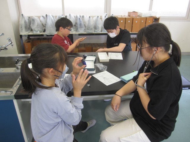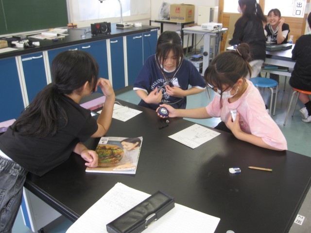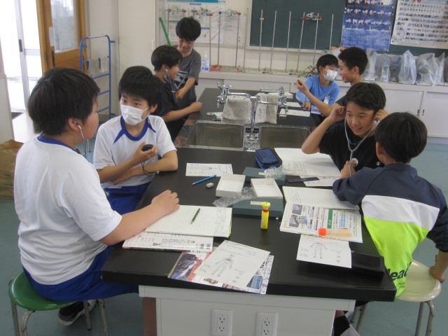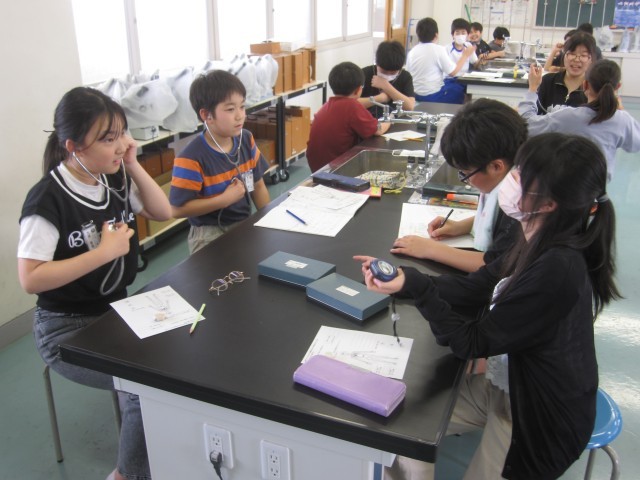 5月23日(金)6年生 理科 公開日 2025/05/23 更新日 2025/05/23 できごと 脈拍計や聴診器、心音マイクなどを使って、1分間の脈拍数と心臓の拍動数を調べました。脈拍数と心臓の拍動数は、ほぼ同じであることがわかりました。 +5