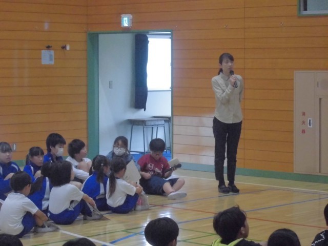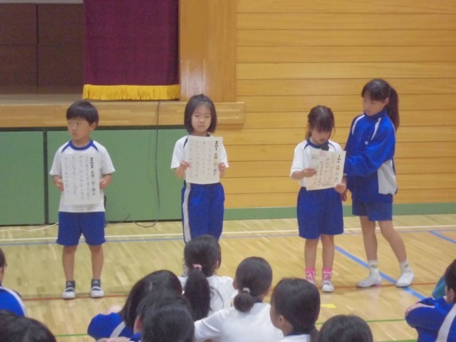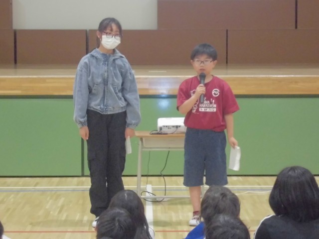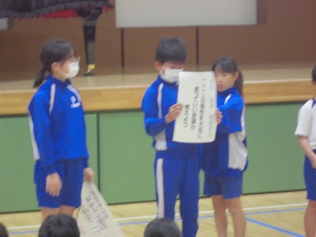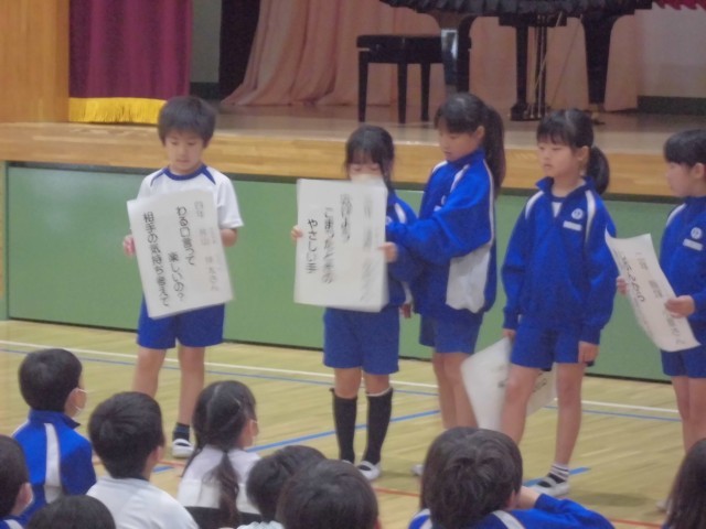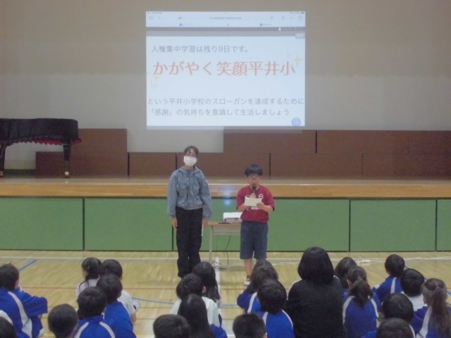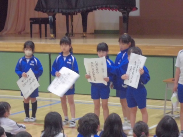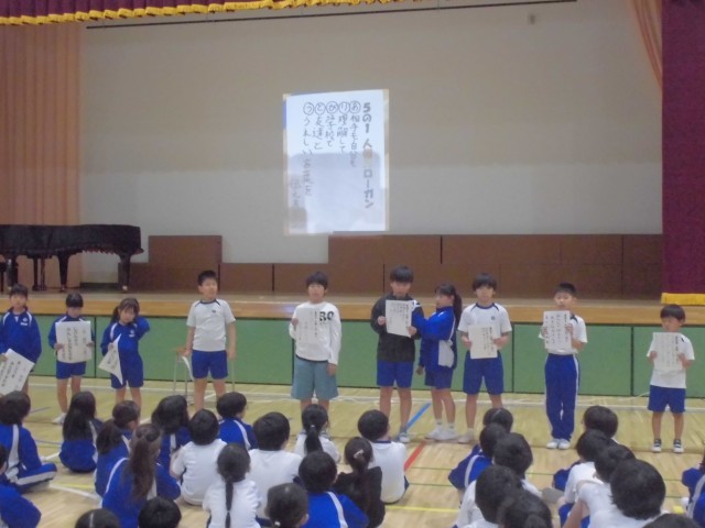 5月23日(金)人権集会 公開日 2025/05/23 更新日 2025/05/23 できごと 人権集中学習中の真ん中で、クラスごとに決めた人権標語や、クラスの代表となった標語を、みんなの前で発表しました。児童会からもハッピーハートフルツリーの進み具合の確認や、残りの日も意識していきましょう、と自作のスライドで発表がありました。 +6