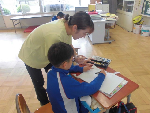みずとぴあへ向かう前に着替えを済ませたようすと、算数の角度の学習のようすです。