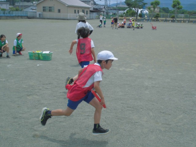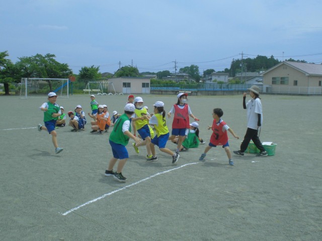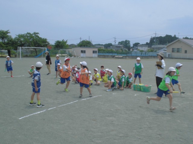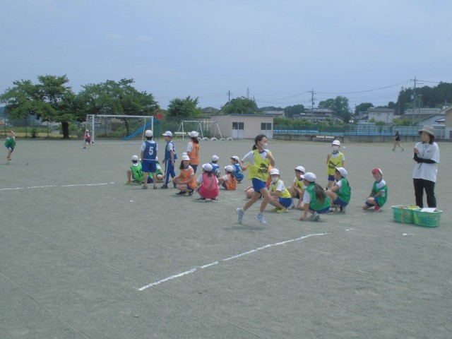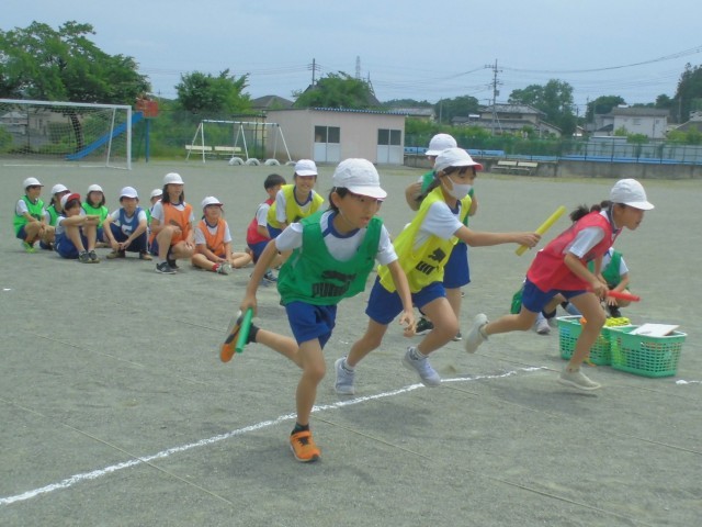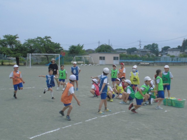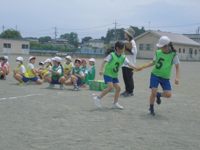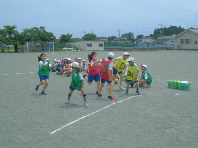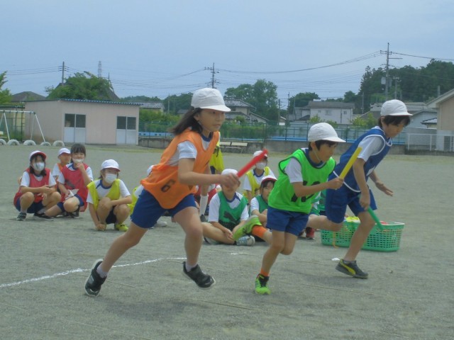 チーム分けのビブスがカラフルです。3、4年生合同のリレー形式でバトンパスの練習をしました。