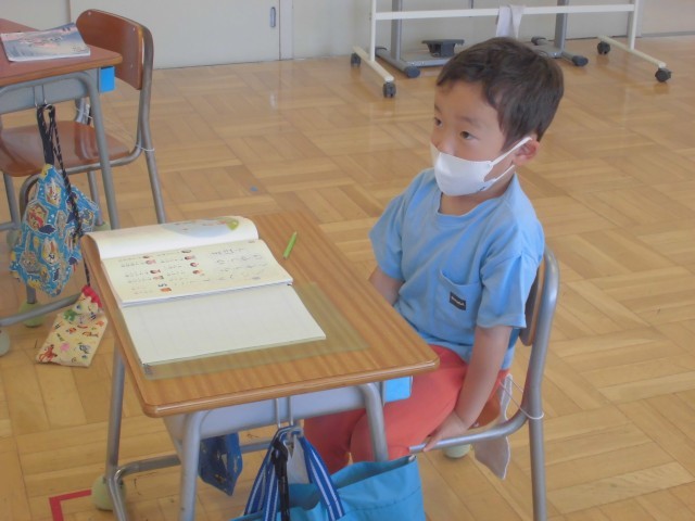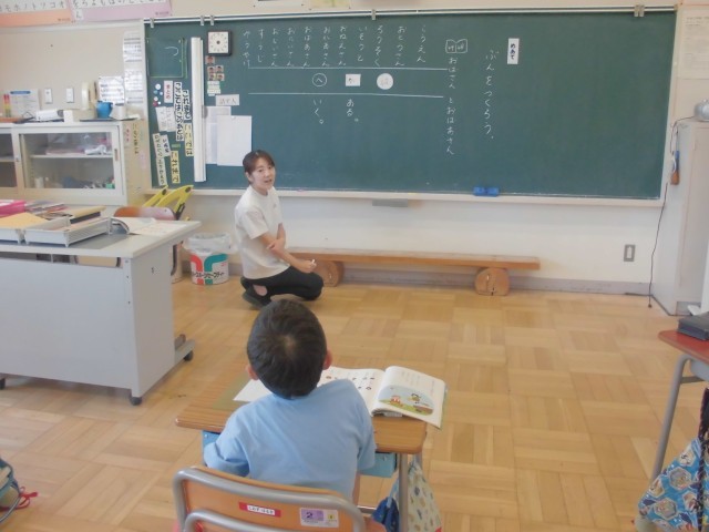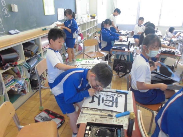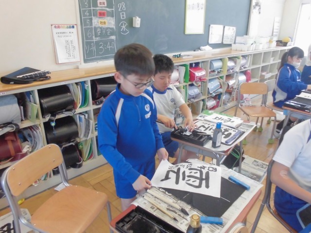 個別に文章作りの国語の授業のようすと、交流学級の毛筆で最後まで集中して作品を仕上げるようすです。