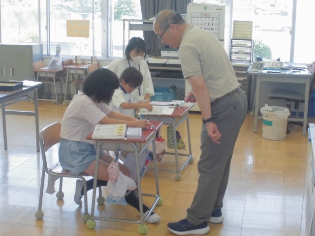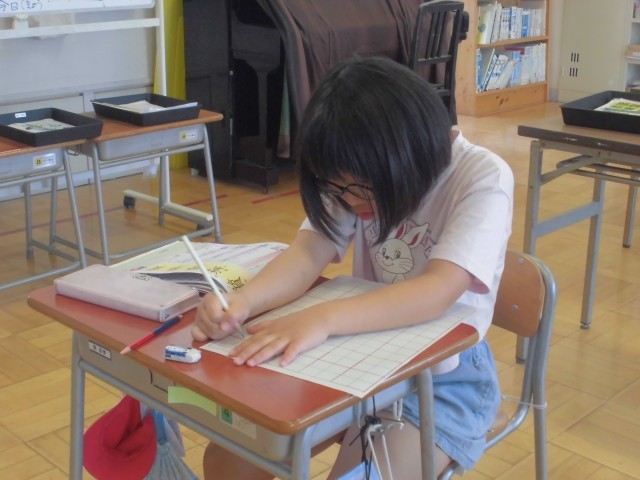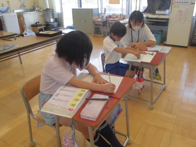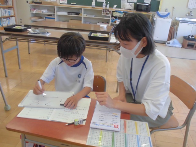 個別に、新出漢字の学習をしているようすと、算数ドリルで計算を頑張るようすです。