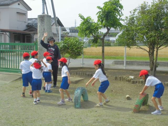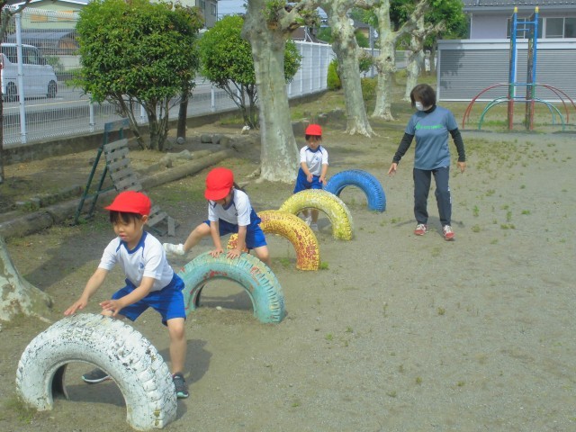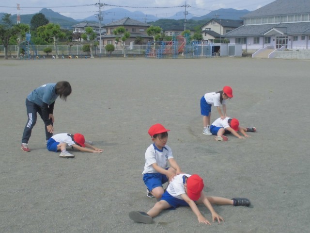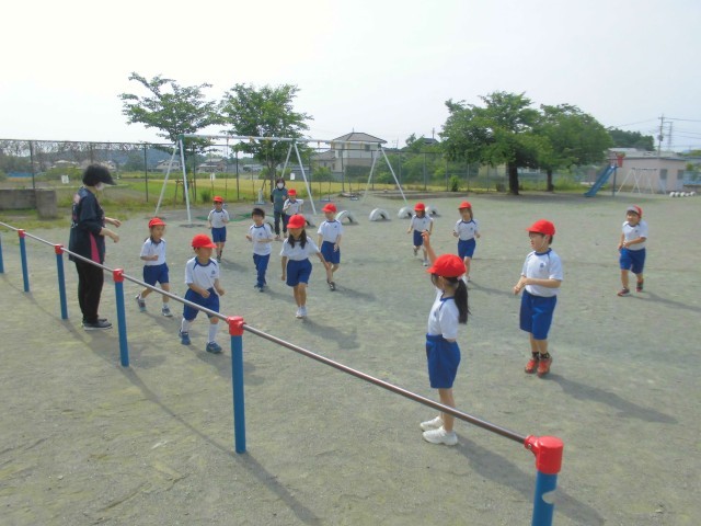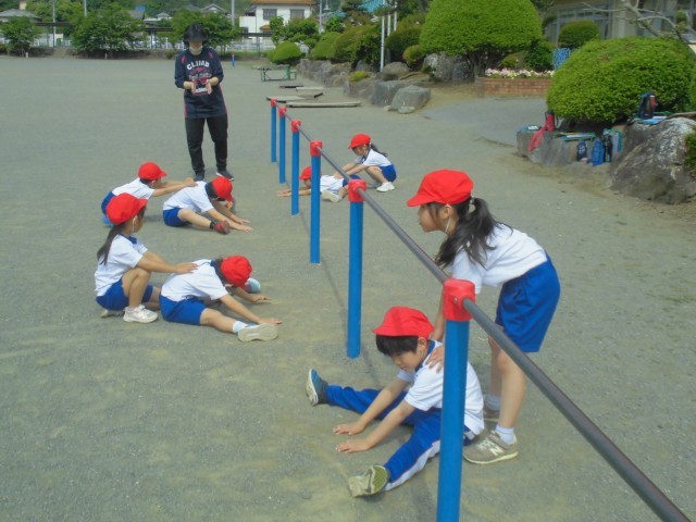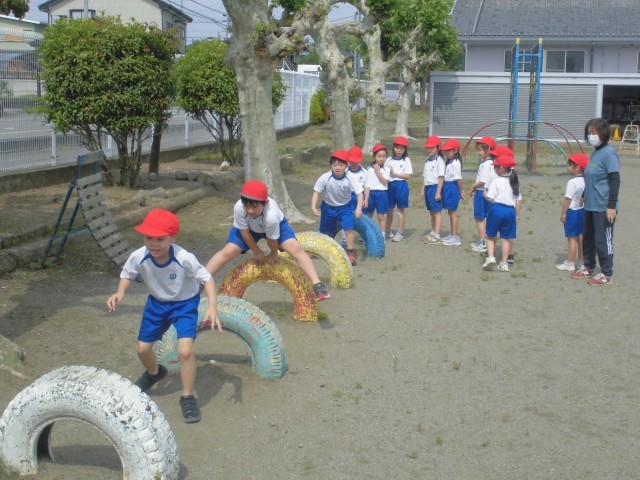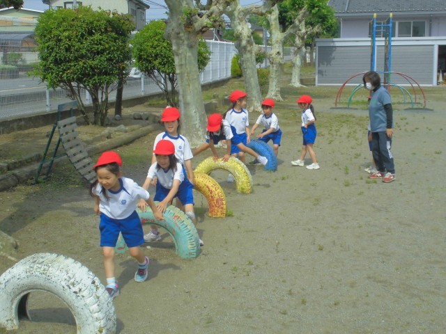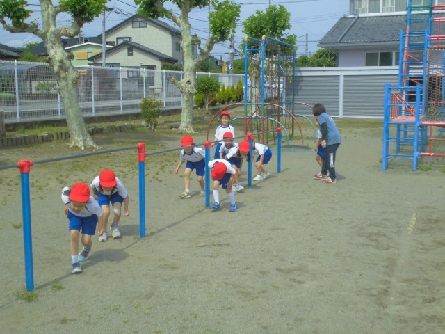 準備運動の後、校庭の遊具でサーキットをして、身体をよくぼぐします。
