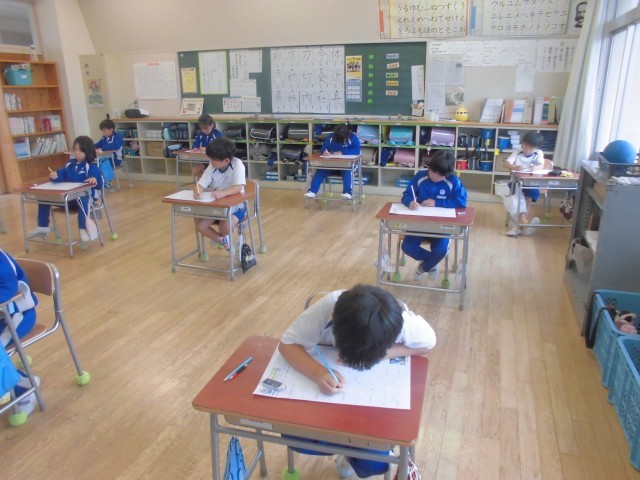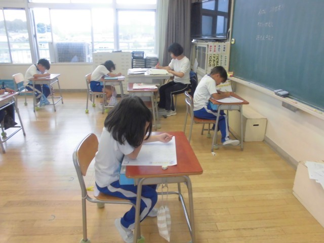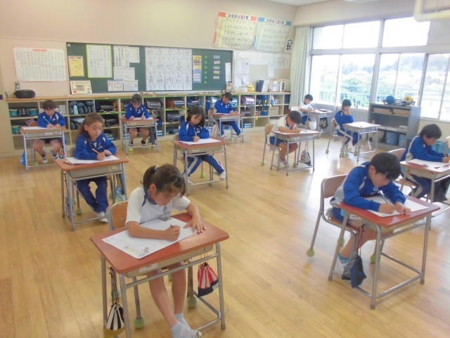 人数が少なめなので、間隔を広く開けて、国語のテストです。
