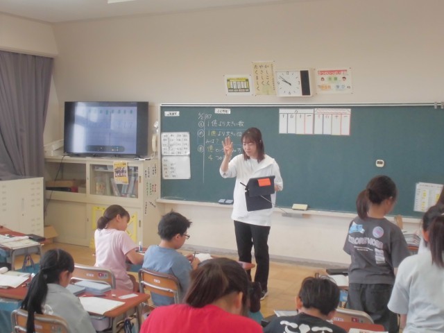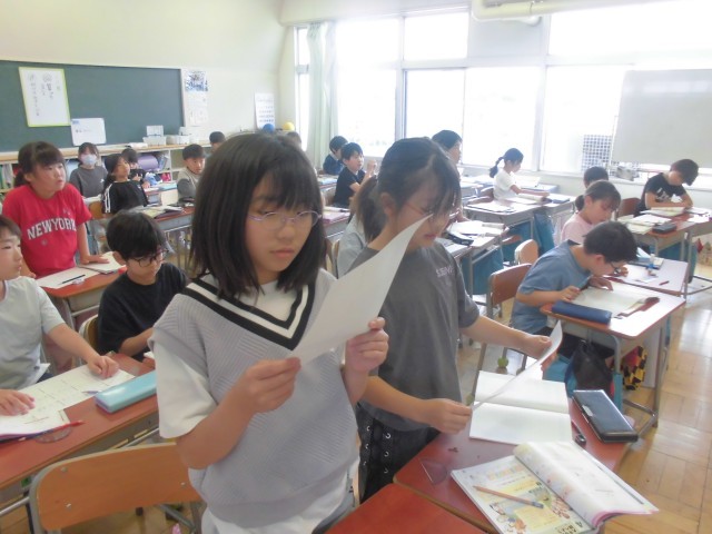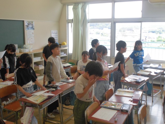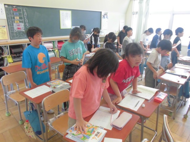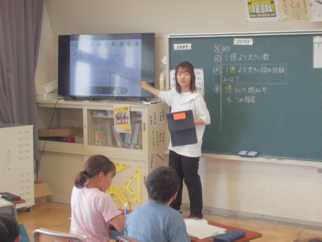 一億より大きい数の読み方を練習します。立って読み上げて、読み上げ終わると座ります。