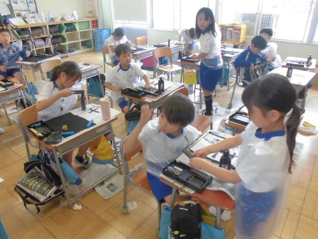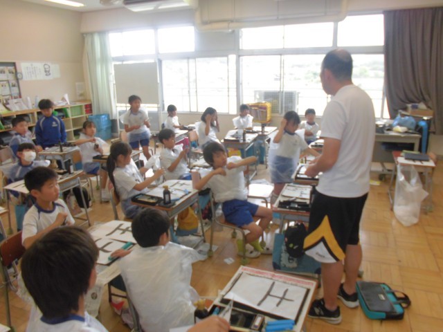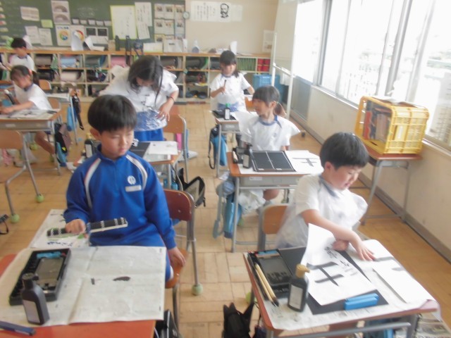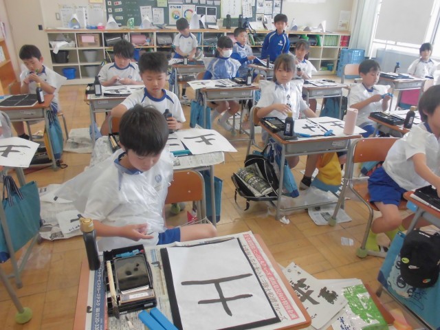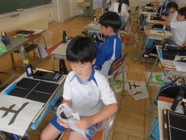 墨で汚れないように工夫しながら、毛筆の「土」に挑戦します。