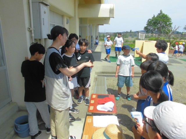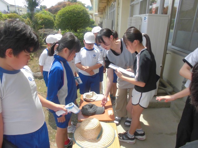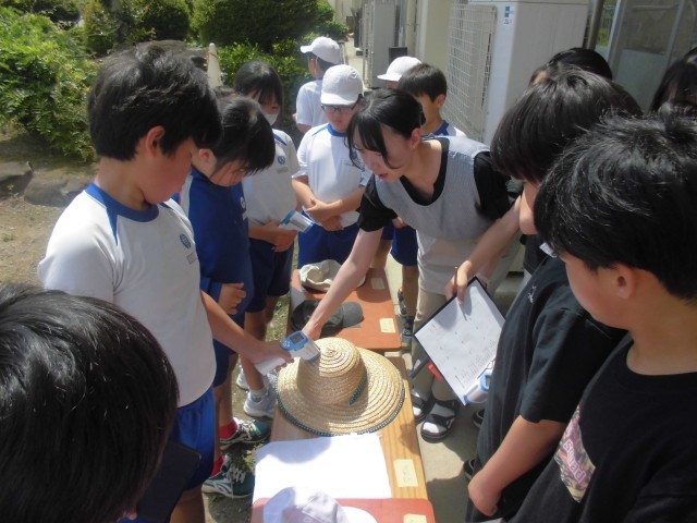 6月6日(金)保健委員会の実験 公開日 2025/06/06 更新日 2025/06/06 できごと 気温も上昇した昼休み、学校保健委員会に向けて、保健委員のメンバーが実験をしました。帽子(白、黒、麦わら)、体育帽子(白、赤)、白タオル、何もなし… これらを頭にのせていた場合、熱の上昇を何℃おさえることができるか? 結果は学校保健委員会で発表します。お楽しみに。 +2