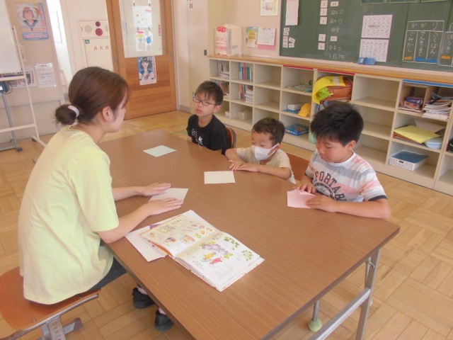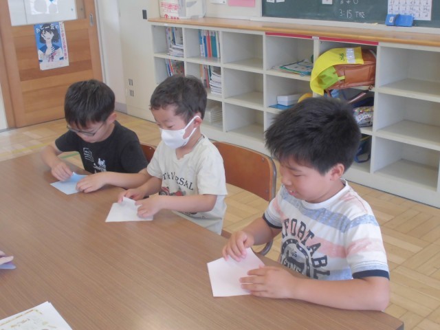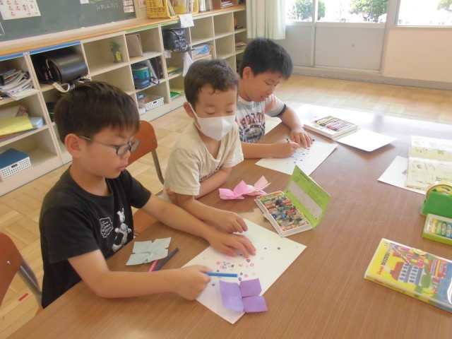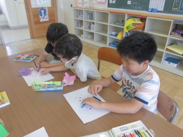「梅雨」の季節を感じるために、折り紙であじさいを折って、掲示物を制作しました。