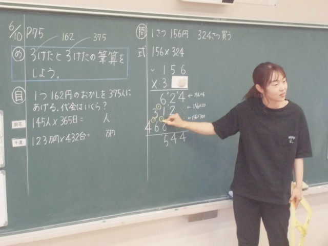 6月10日(火)4年生 算数 公開日 2025/06/10 更新日 2025/06/10 できごと ホワイトボードとテレビには、これまでの2桁のかけ算の方法がまとめられています。本時は、3桁の3桁のかけ算の筆算方法をみんなで考えます。 +3
