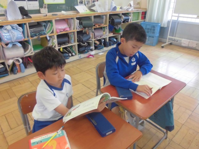 ペアになって教科書を読み合います。