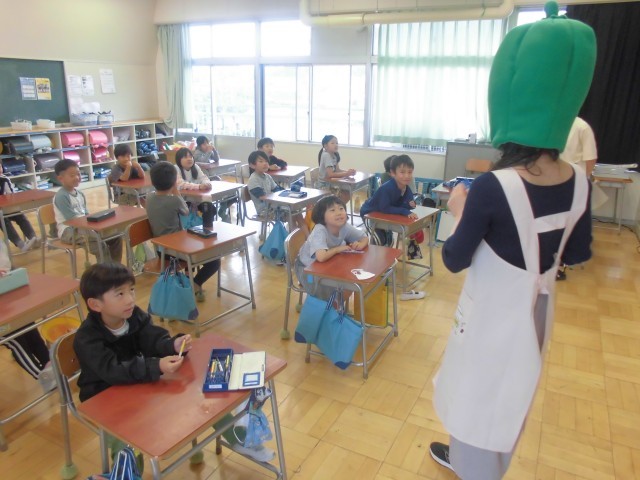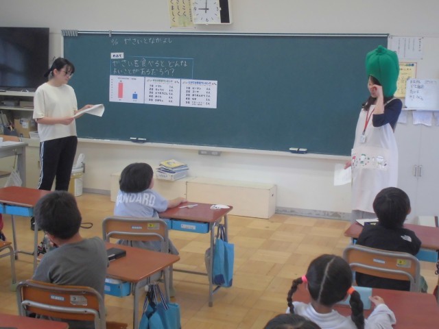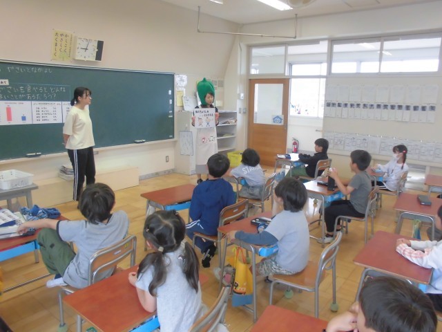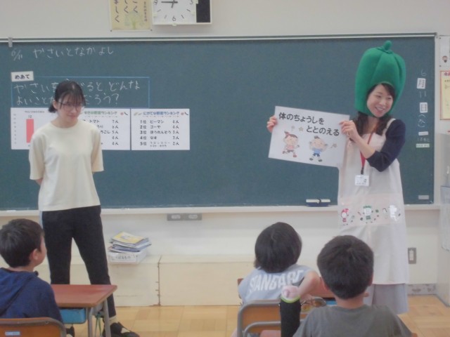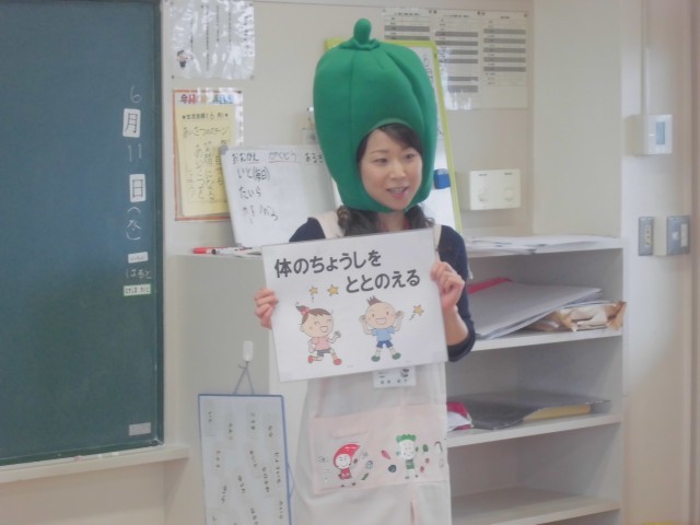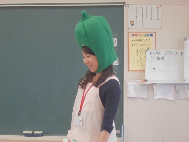 6月11日(水)2年生 食育 公開日 2025/06/11 更新日 2025/06/11 できごと 給食センターの栄養士さんが来校し、苦手野菜ナンバーワンのピーマンになって、ピーマンの気持ちをみんなに教えてくれました。 +4