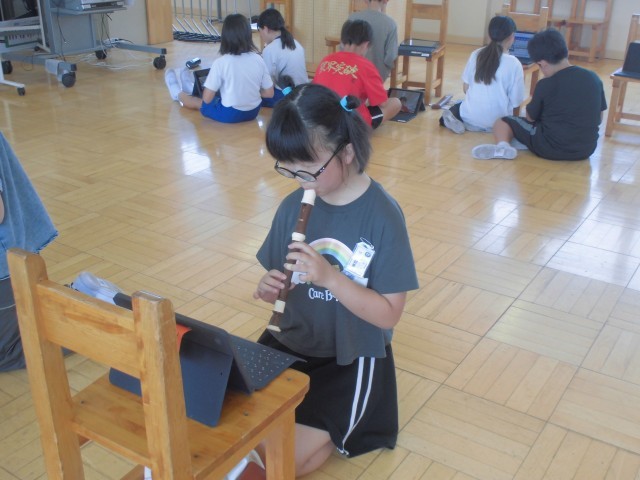 交流学級で友だちと楽しく折り紙を楽しむようすと、音楽でリコーダーを頑張るようすです。