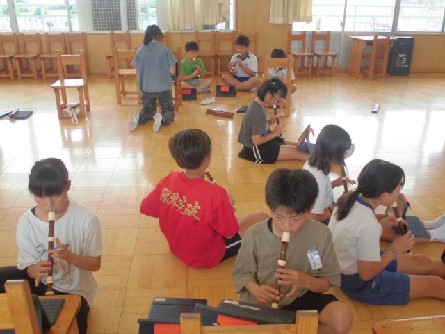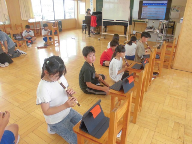 タブレットに送られている楽譜を見ながら、それぞれリコーダーで演奏します。