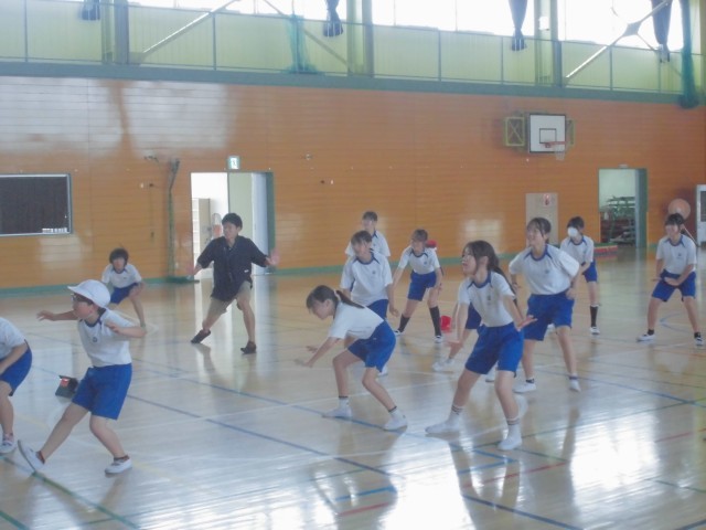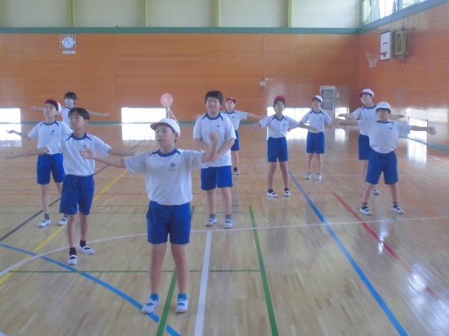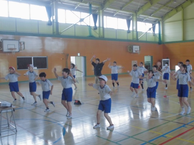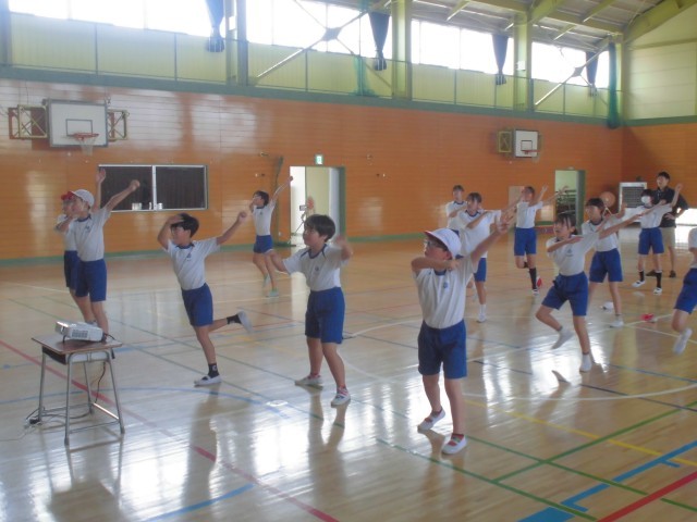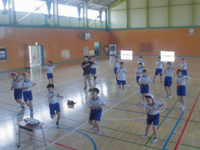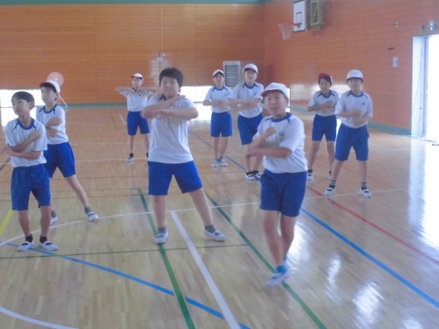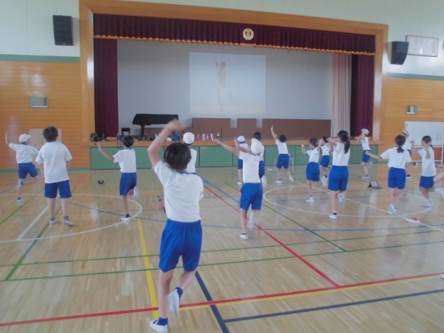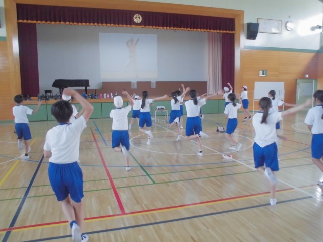 スクリーンに映されている動画に合わせてダンスです。計画的に運動会の練習も始まっています。