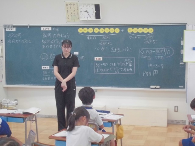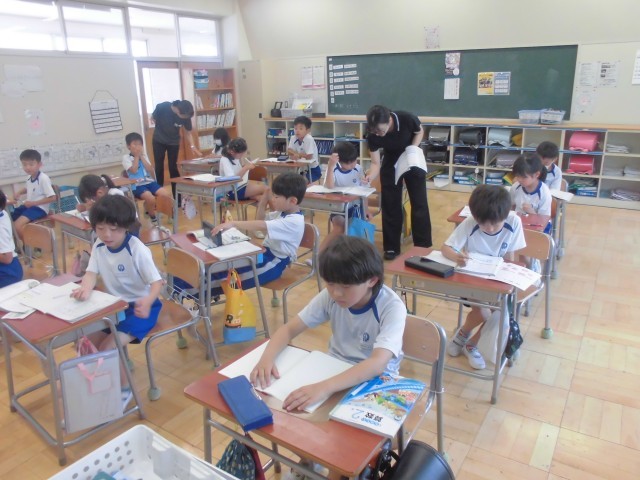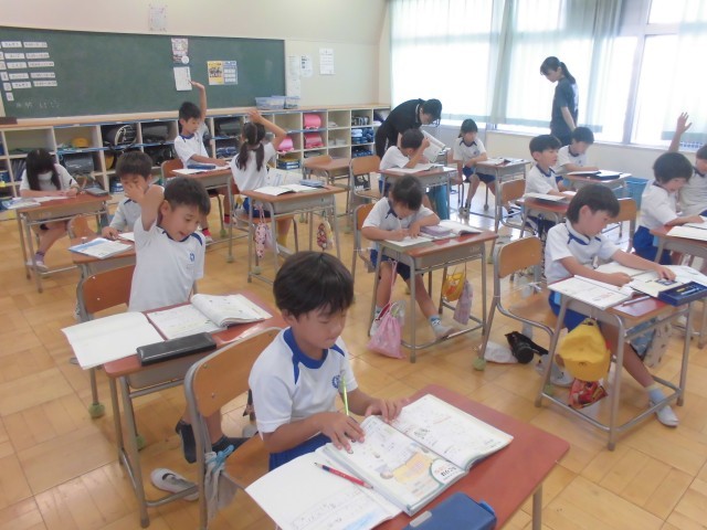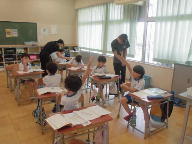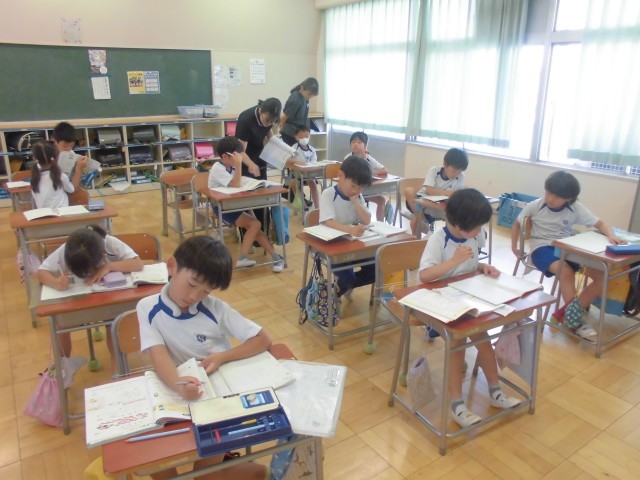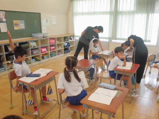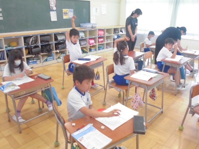 まとめも終わり、振り返りの問題に挑戦中です。挙手をしてマル付けの先生を待ちます。
