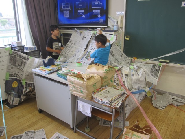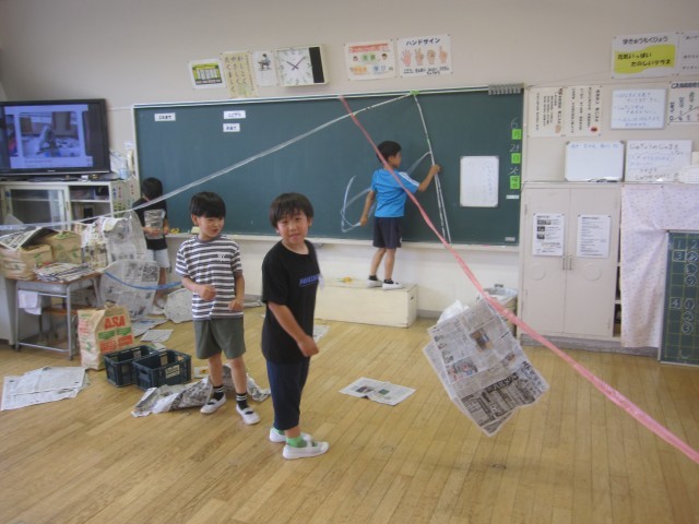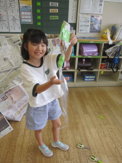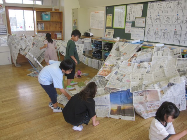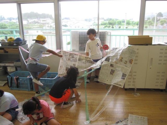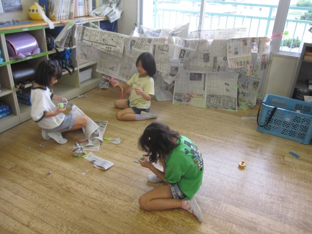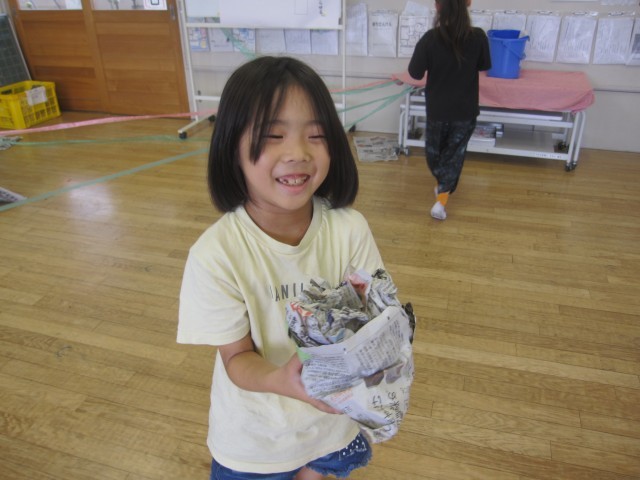 新聞紙を使って、造形あそびをしました。どの子も夢中になって活動していました。
