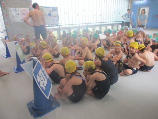 コースごとに並んで、プールへの移動を待つ場面です。