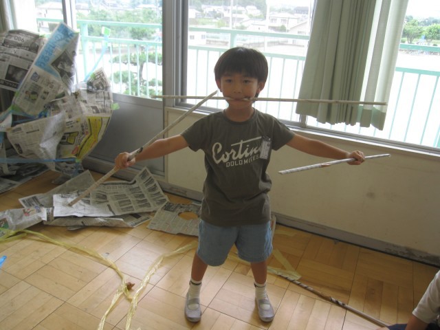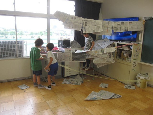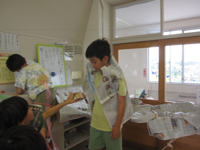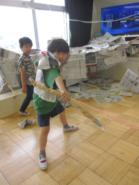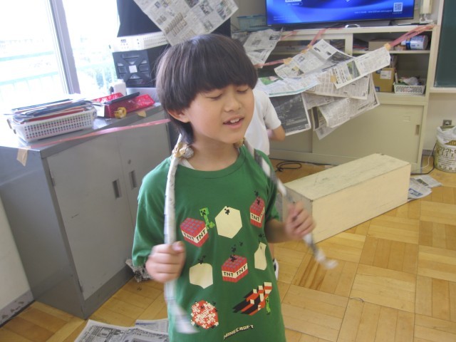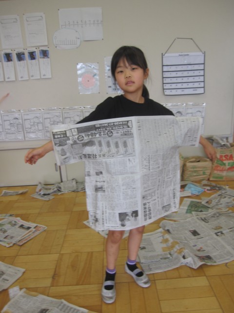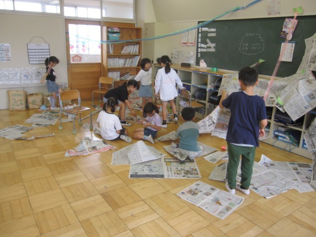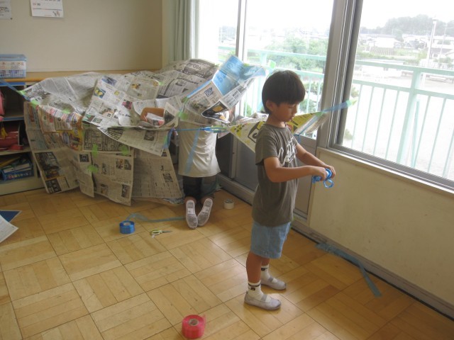 新聞紙を使って、造形あそびをしました。コスチュームや秘密基地などをつくって楽しみました。