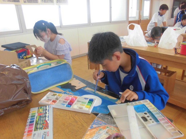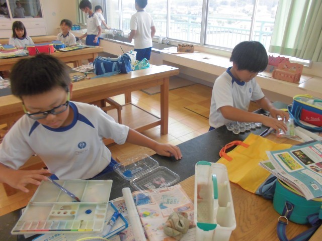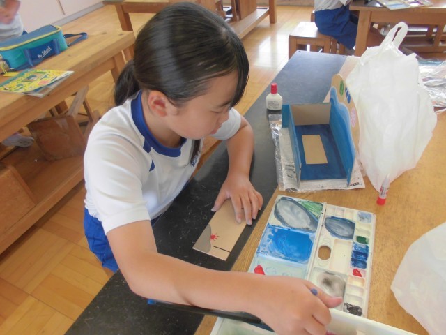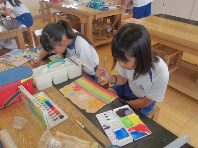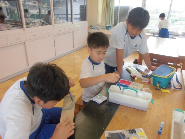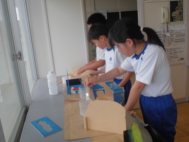 3人ずつ順番にニスを塗っていきます。カラフルでかわいいティッシュボックスが仕上がっていきます。