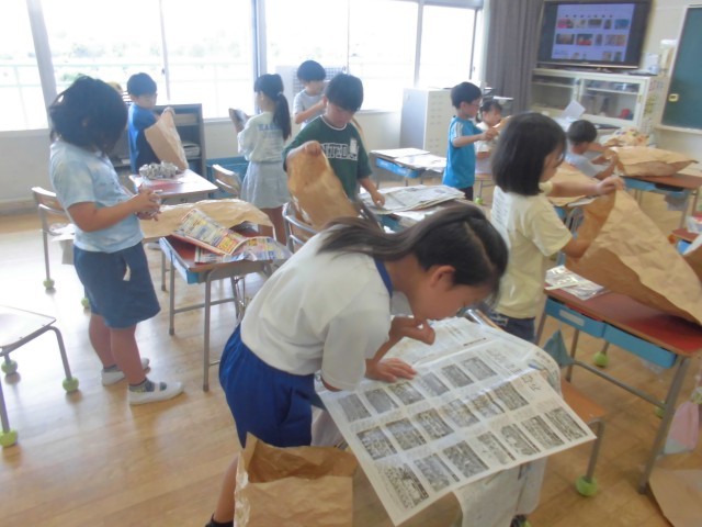 大きな紙袋に新聞紙をつめて、何か作品を製作中のようです。詳細は後日にお知らせします。
