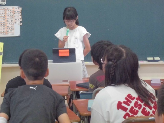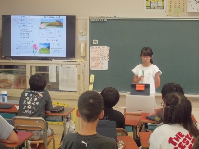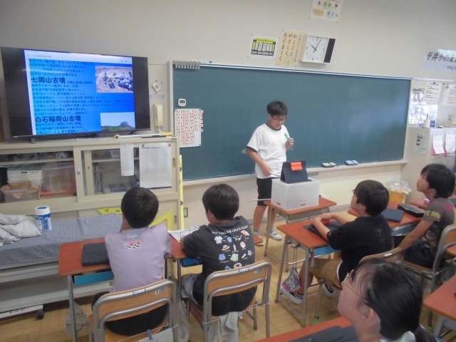 地元の古墳について、タブレットでまとめた内容を、みんなの前でプレゼンします。マイクがいいですね!