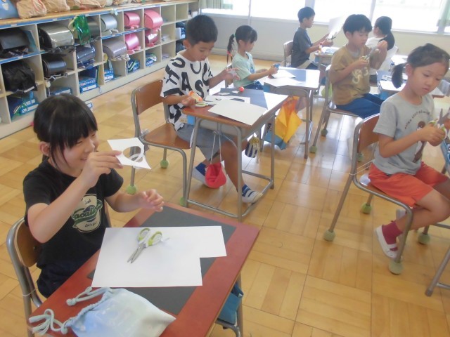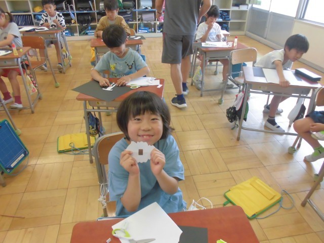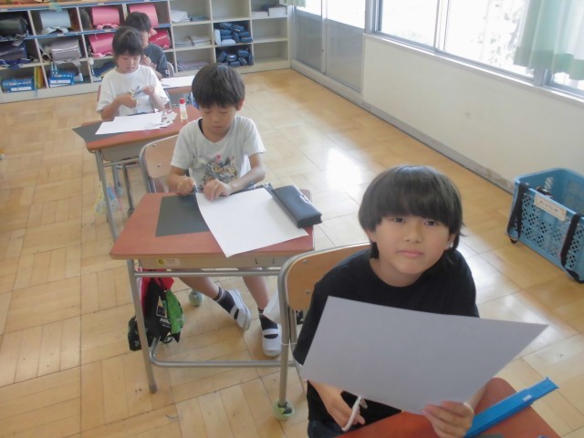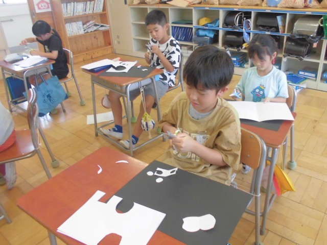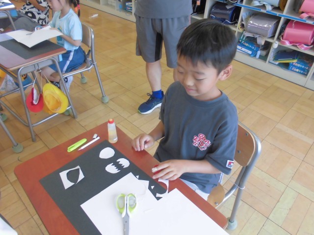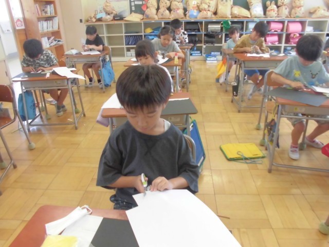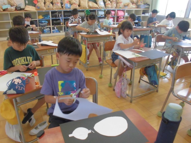 白い画用紙を自由に切って、黒の台紙に貼り、モノトーンの世界を表現します。