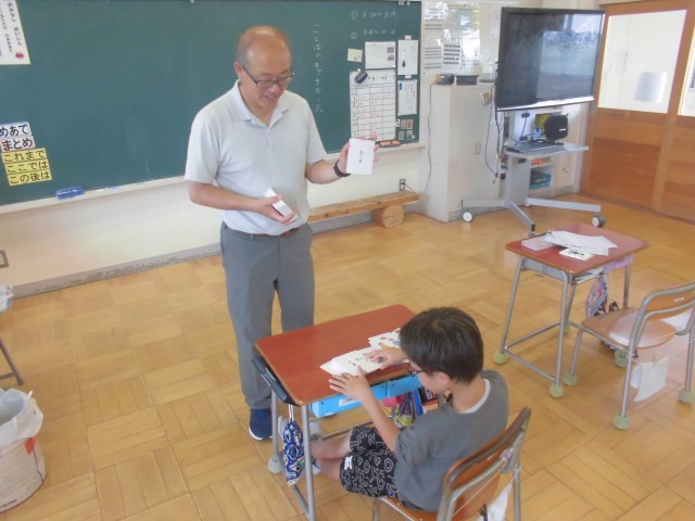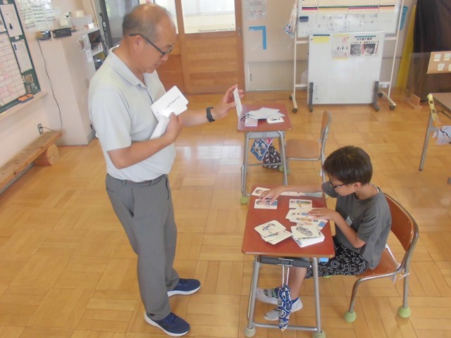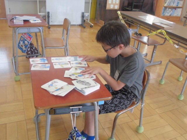 言葉と、その動作がイラストになったカードを合わせるようすと、交流学級の体育でソーランを練習するようすです。