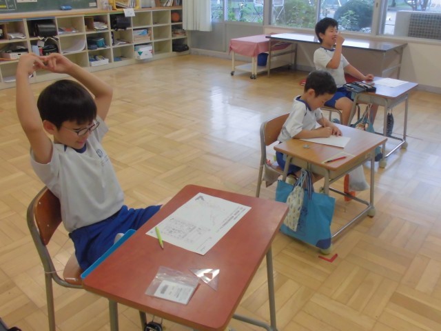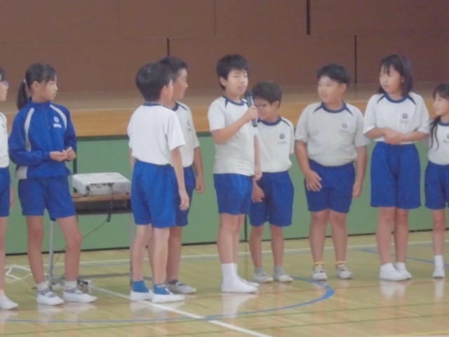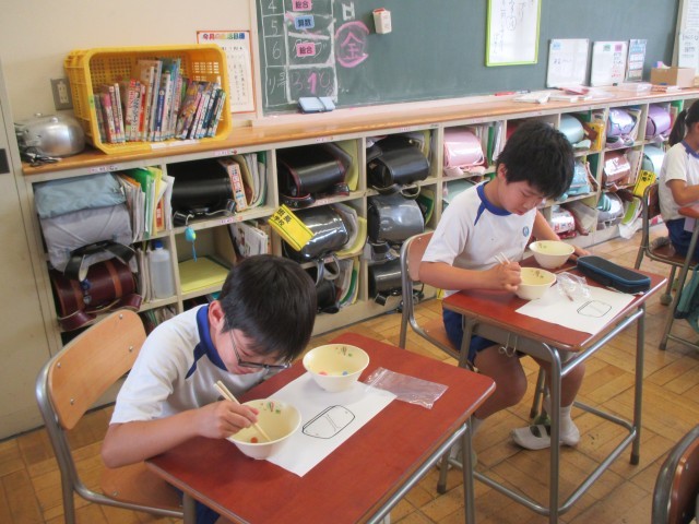 朝の音楽集会、教室での漢字練習、交流学級での食育授業のようすです。