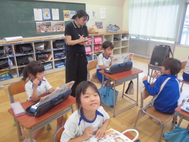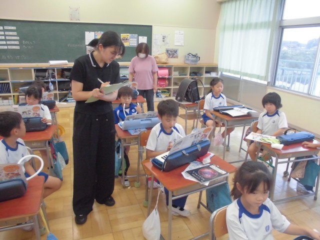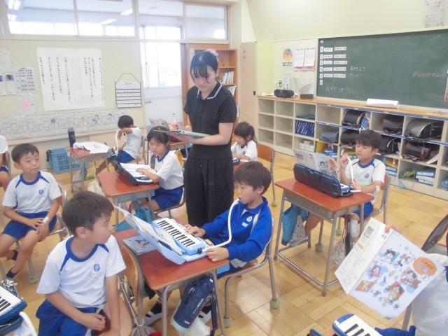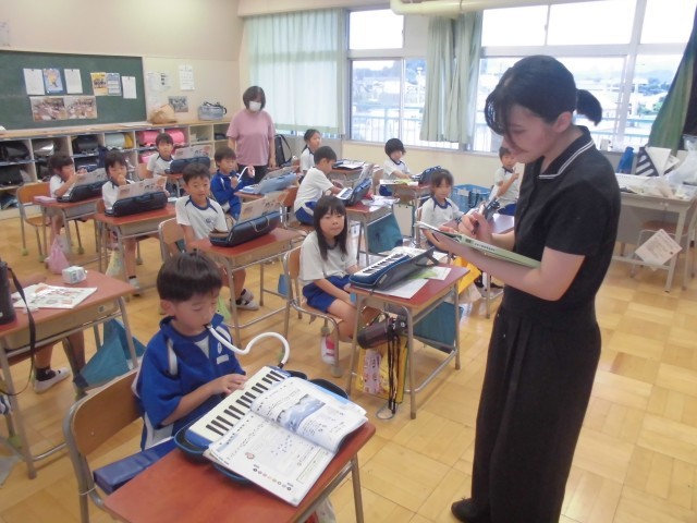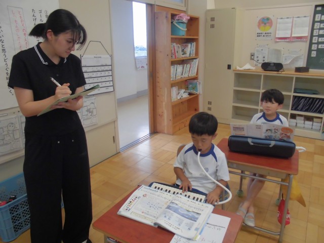 鍵盤ハーモニカの評価です。一人一人演奏し、周りはその演奏をよく聞きます。