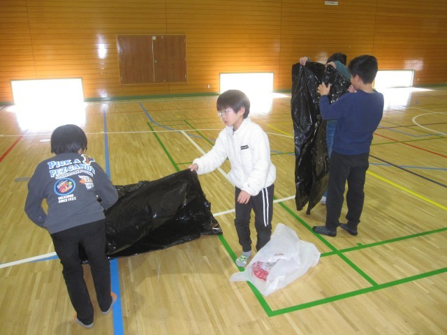 農業用マルチを使ってソーラーバルーンを作ります。4人1組で7班に分かれて作って...