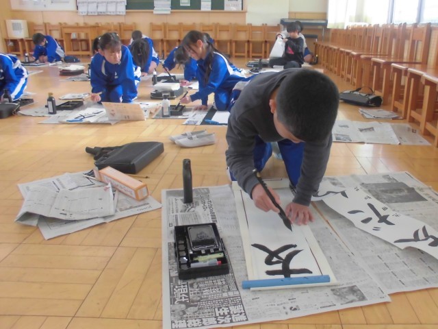 書き初め大会のようすです。6年生は体育館で実施しました。