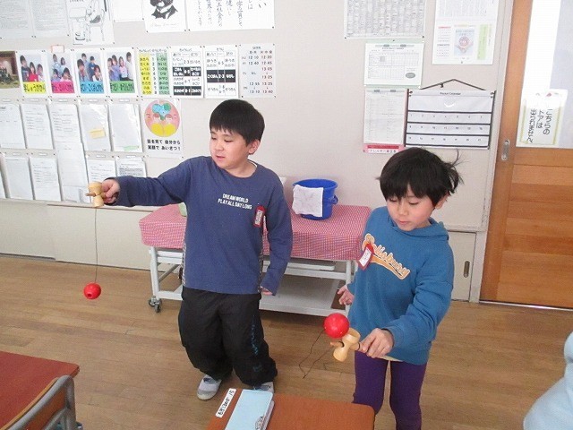先日教わった「昔から伝わる遊び」を教室でもう一度楽しんでます。「見て見て!けん玉...