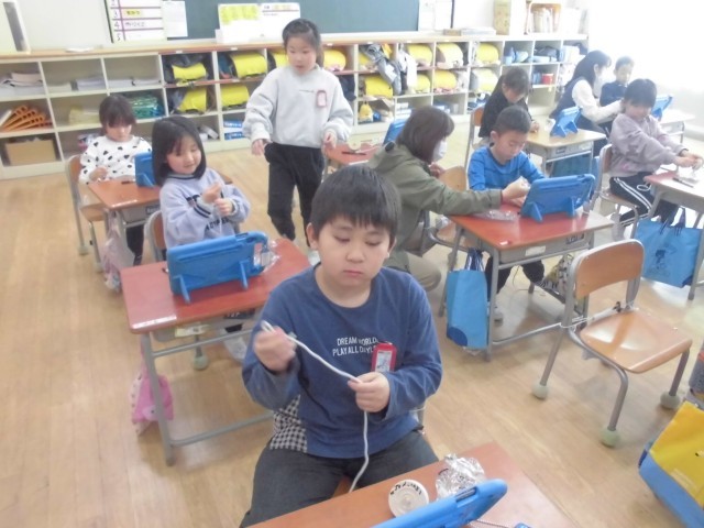 タブレットでひもの準備と巻き方を確認して、コマ回しに挑戦です。ひもを引きながら回...