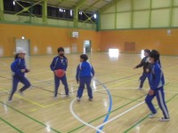 ボールに素早く対応できるように、3オン3のバスケットボールです。