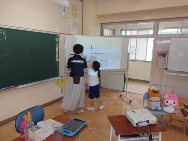 2年生は算数でかさの学習をしています。今日は、10デシリットルが1リットルであることを使って、18デシリットルをどのように表したらよいか考えています。先生といっしょに考えながら、10デシリットルが1リットルだから、「1リットルと8デシリットル」というふうに図をつなぎ教材にして答えていました。最後は確認で「1リットルは何デシリットル」という問いに「10デシリットル」と元気よく答えていました。