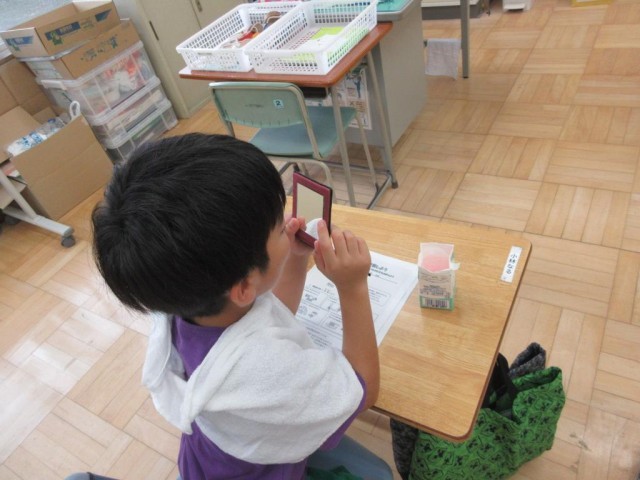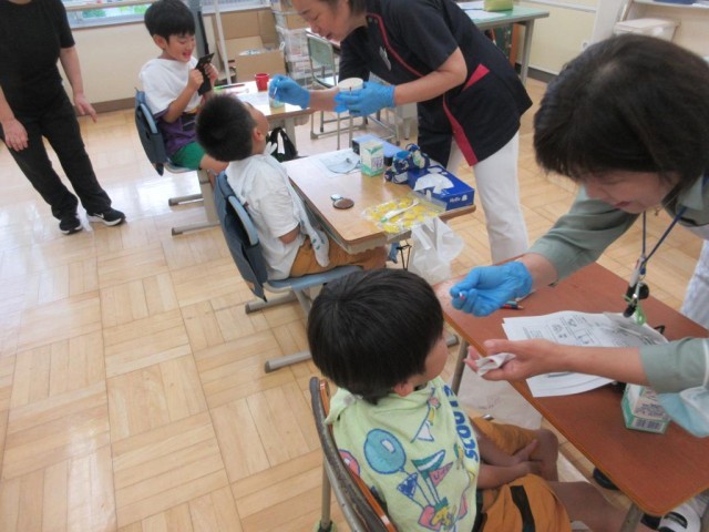 低学年の子どもたちは、夏休み前に歯の健康を守るために、ブラッシングがどれぐらいできているかを確認するため、歯科衛生士さんを招いて「歯の染め出し体験」を行いました。最初に、歯の大切さや、口の中にはたくさんのばい菌がいるので歯磨きがとても大切なことなどを教えてもらった後、いよいよ染め出し用の液を歯につけてもらって、手鏡で確認してみました。しっかり歯磨きできいない部分が赤く染まったのをみてちょっと恥ずかしそうでした。この後正しいブラッシングを教えてもらいます。