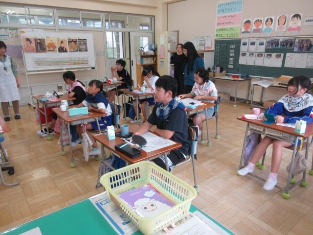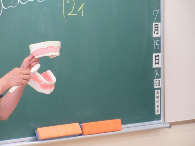 低学年の子どもたちに続き、高学年の子どもたちも歯の染め出しで、ブラッシングができていないところを確認しました。歯科衛生士さんからは12歳臼歯が虫歯になりやすいので気を付けて磨くようにとのお話しがありました。続けて歯ブラシの使い方を確認していきます。