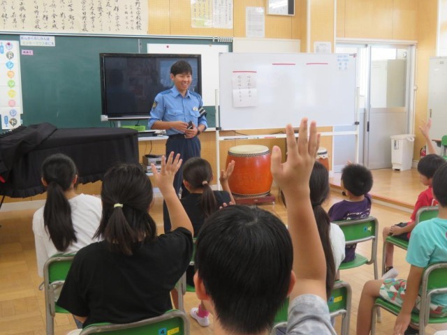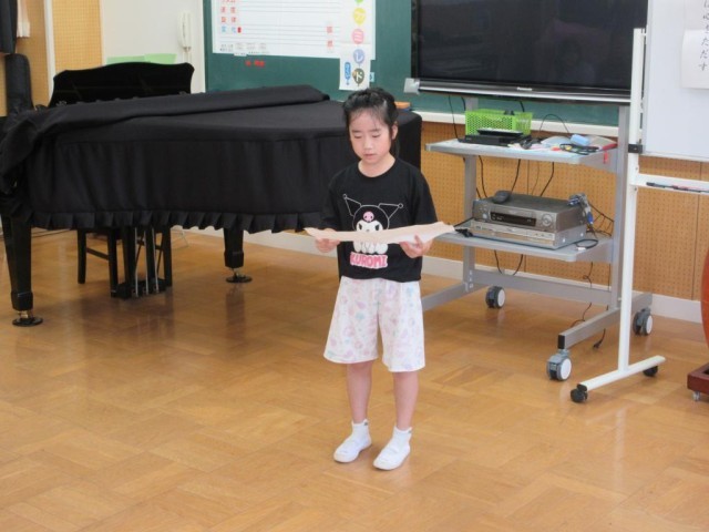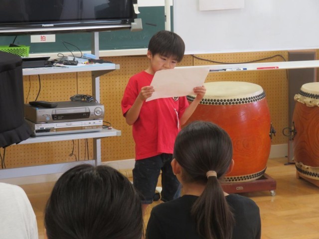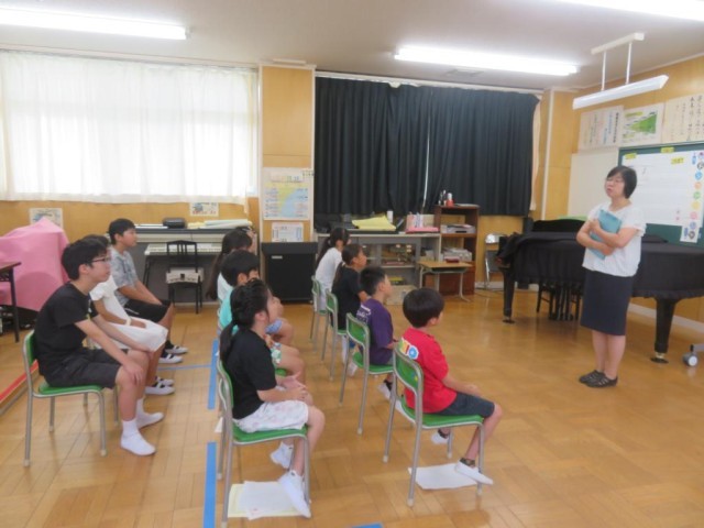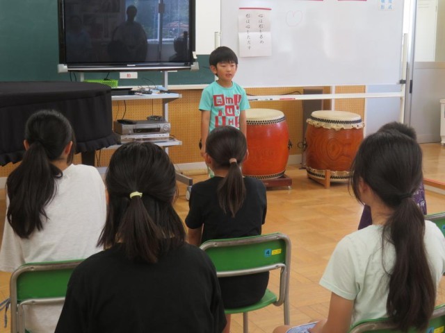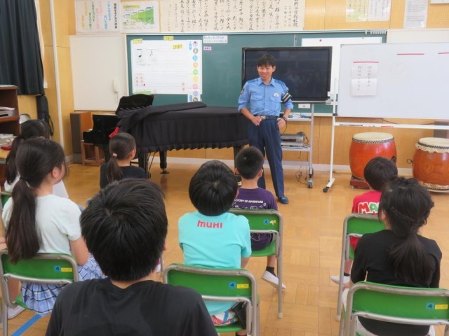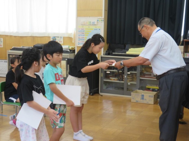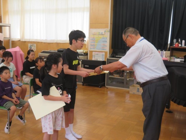 今日は1学期最後の日です。1校時は終業式を行いました。最初に歯の関係の表彰や、漢字・計算コンテストの満点賞の表彰を行いました。続けて校歌斉唱、大きな声でよく歌えていました。校長先生のお話の後、1学期にがんばったことの発表がありました。漢字コンテストの練習、社会科の地図記号を覚えること、九九をがんばったことなどそれぞれが、自分でがんばったことを発表しました。また、今日は日野駐在の方をお招きして夏休みの事故への注意についてお話しをいただきました。クイズや具体的な事例を交えてわかりやすくお話しいただき、最後は「自分で気を付けることが一番大事」と伝えていました。明日から夏休み、健康に気を付けて充実した夏休みを送ってほしいと思います。日野駐在さん、ありがとうございました。子どもたちはこの後通知票を受け取ったり、夏休みの注意事項を確認したりします。