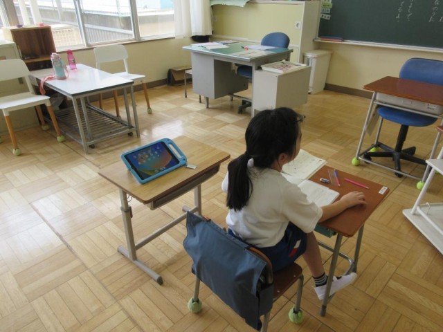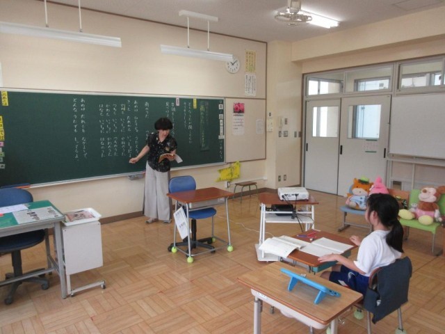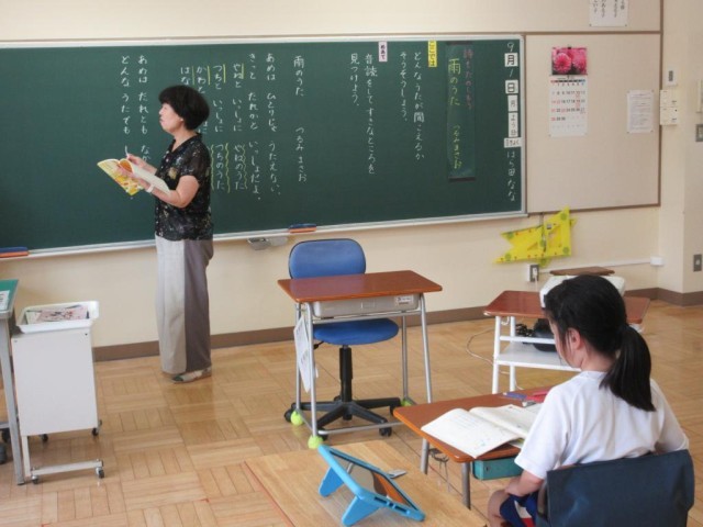 2年生は国語の学習で詩の朗読に取り組んでいます。「雨のうた」という詩で、雨がいろんな仲間と歌を歌うように降っているようすをあらわした詩です。読みながら、どんな仲間がいたのか、どんな歌になったのかを考えています。途中、「実際はどんな歌だったんだろうね」という先生の問いかけに、一生懸命考えて、想像をふくらませていました。