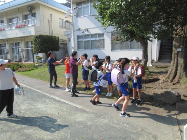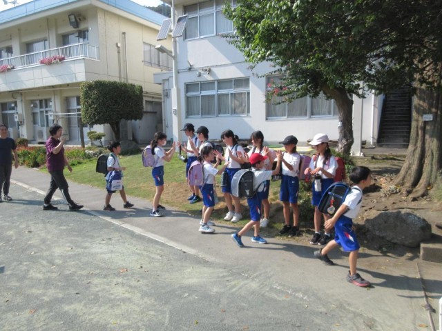 毎週金曜日は、ハイタッチを交わしながらあいさつをして帰る「スマイルハイタッチあいさつ運動」の日です。2学期の最初は6年生が音頭をとってあいさつ運動をしました。元気よく「さようなら」「バイバイ」と声を交わしながらハイタッチをして帰りました。
