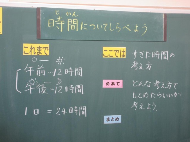 2年生は算数で時間の学習をしています。これまでの学習を振り返り、「午前」や「午後」が何時間で1日が何時間なのかを確認した後、「○○をするのに何時間かかったでしょうか」という問題に取り組んでいます。1対1の授業なので、児童の様子に合わせ丁寧に学習が進められています。